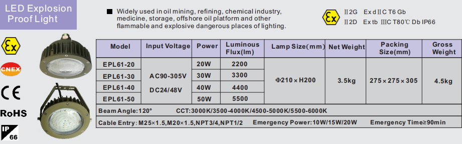 | EPL61-30 | AC 90–305V | 30W | 3300 | Φ210 × H200 | 3.5 kg | 275 × 275 × 305 | 4.5 kg |