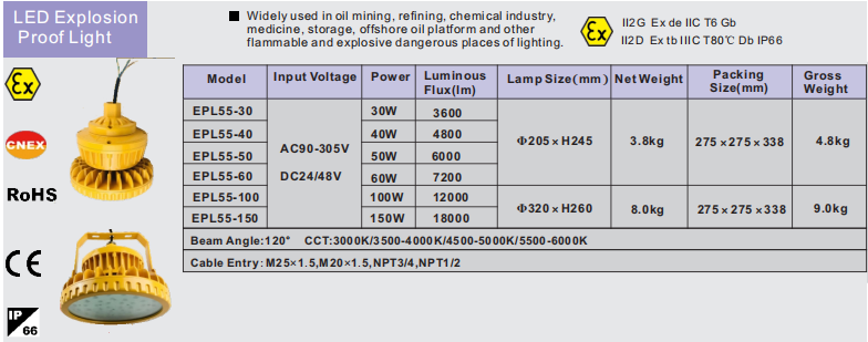 Vỏ bằng nhôm đúc sơn phủ chống tĩnh điện và chống ăn mòn, cấp độ chống cháy nổ cao theo kiểu chống cháy kín; chống bụi, chống nước; thấu kính làm từ vật liệu PC chống đạn có khả năng chịu nhiệt, chống ăn mòn và truyền sáng cao.